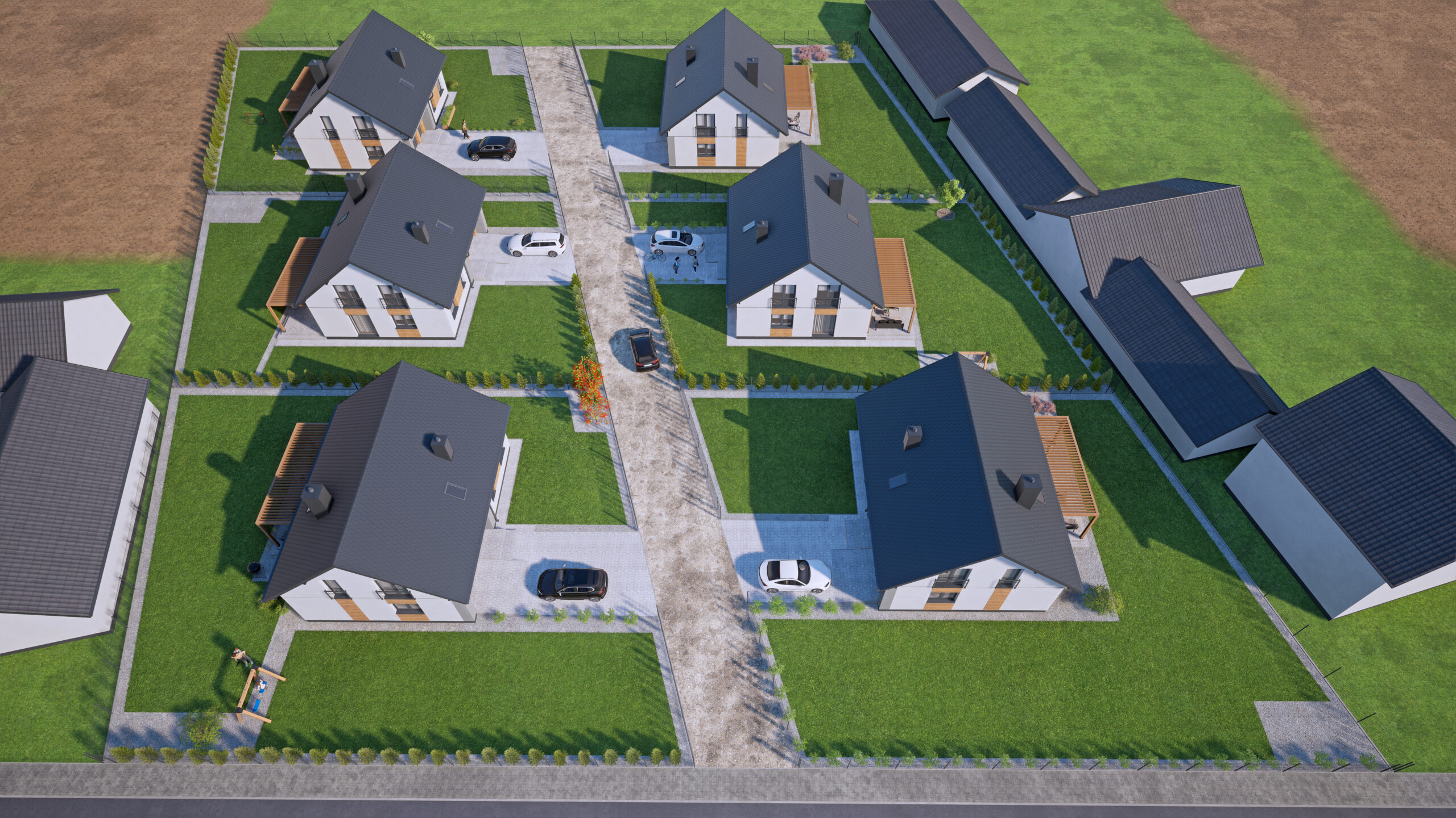 Na przeciwko wjazdu do inwestycji przystanek autobusowy niedaleko znajduje się PKP, sklep, szkoła, centrum kultury z licznymi zajęciami dla dzieci.